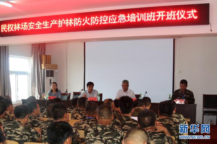 石立忠(臺(tái)上左二)和翟文杰(臺(tái)上右一)在民權(quán)林場安全生產(chǎn)護(hù)林防火防控應(yīng)急培訓(xùn)班開班儀式上(資料照片)。新華社發(fā)