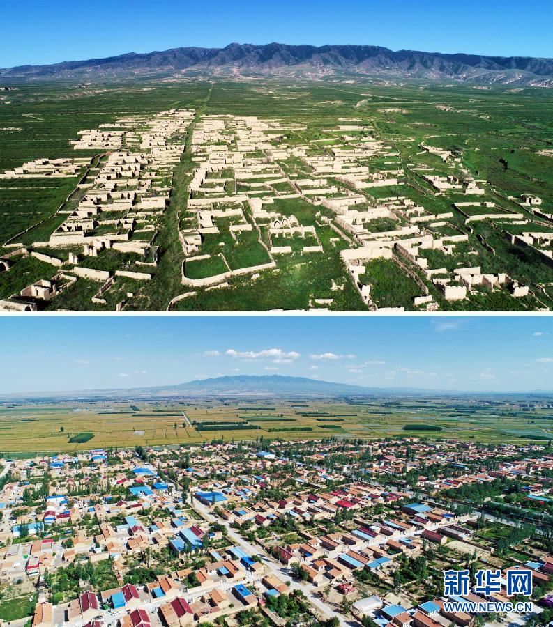 這是一張拼版照片,上圖為:經(jīng)過多年的生態(tài)修復(fù),寧夏吳忠市紅寺堡區(qū)新莊集鄉(xiāng)的移民舊址已逐漸被綠色覆蓋;下圖為:戈壁荒灘上建起的紅寺堡移民新村(2018年9月8日攝,無人機照片)。新華社記者 王鵬 攝