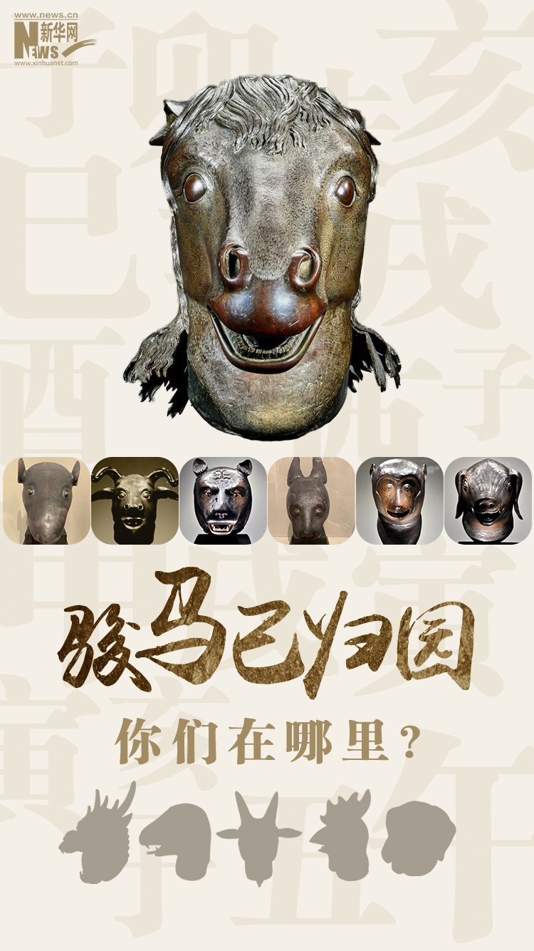 多年來(lái),在國(guó)家文物局和社會(huì)各界力量的共同努力下,已經(jīng)有包括牛首、猴首、虎首、豬首、鼠首、兔首、馬首在內(nèi)的七尊圓明園流失獸首銅像通過(guò)不同的方式回歸祖國(guó)。截至目前,包括龍首、蛇首、羊首、雞首和狗首在內(nèi)的五尊獸首仍然下落不明。(海報(bào)策劃:王瑩? 制作:王曄)