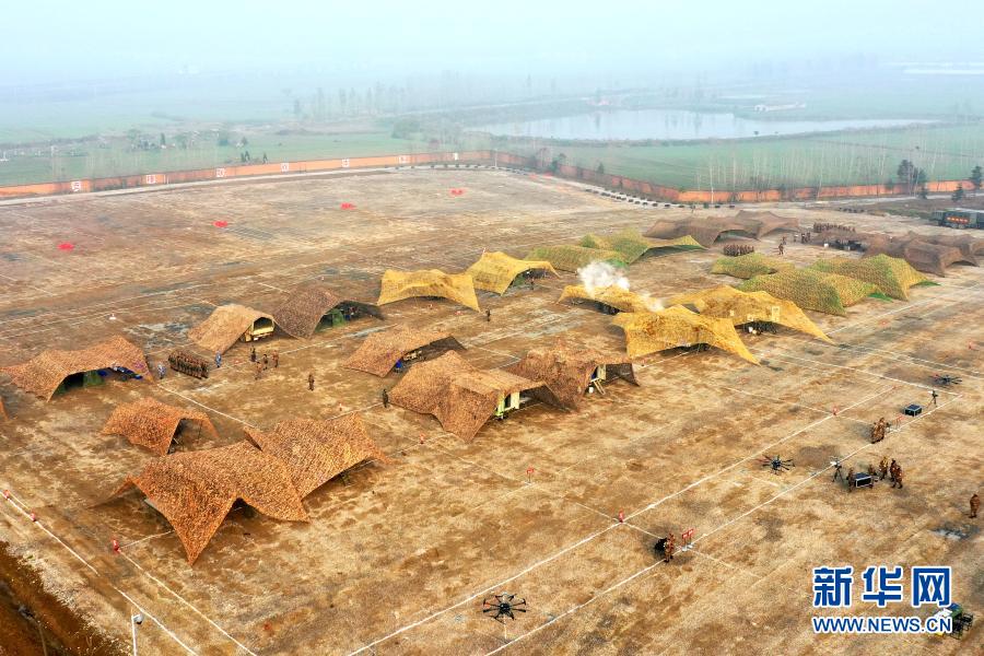 飲食保障隊參賽隊員在偽裝網下的炊事車內加工野戰(zhàn)快餐,并利用無人機前送(11月29日攝,無人機照片)。新華社發(fā)(姜梓涵 攝)