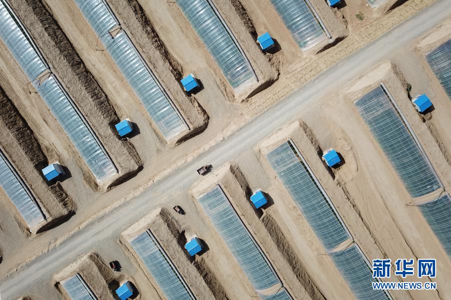 在古浪縣黃花灘生態(tài)移民區(qū)富民新村,村民李應川駕駛三輪車行駛在日光溫室大棚間的道路上(4月9日攝,無人機照片)。新華社記者 范培珅 攝
