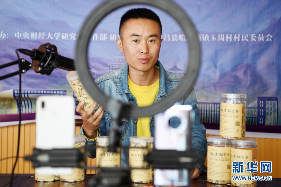 在宕昌縣哈達鋪鎮(zhèn)藥鄉(xiāng)農(nóng)民專業(yè)合作社聯(lián)合社,工作人員網(wǎng)絡直播賣藥材(9月18日攝)。新華社記者 范培珅 攝