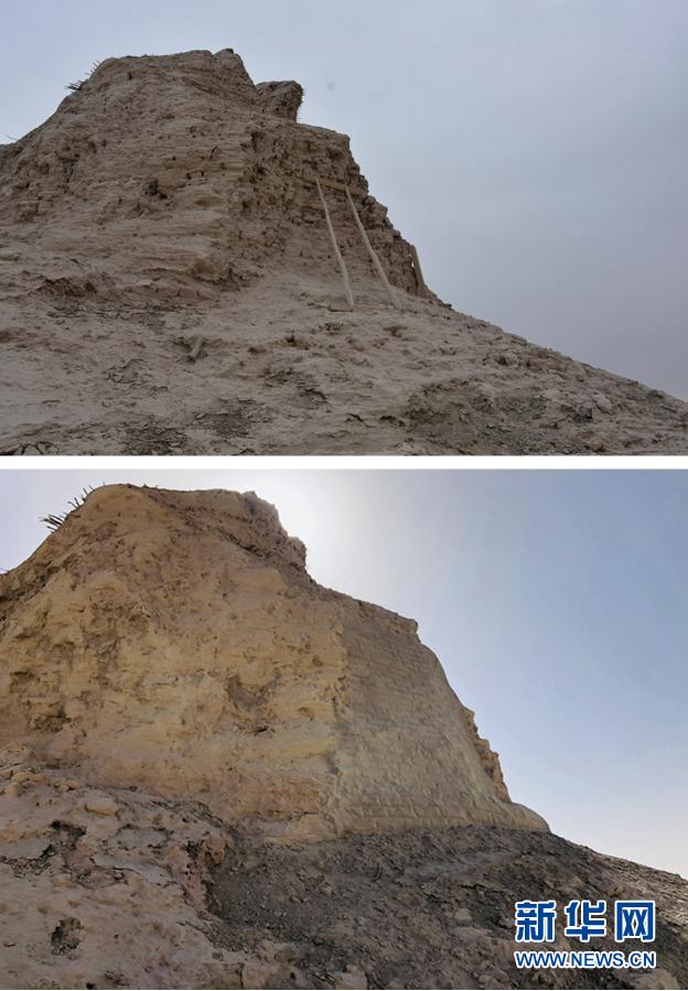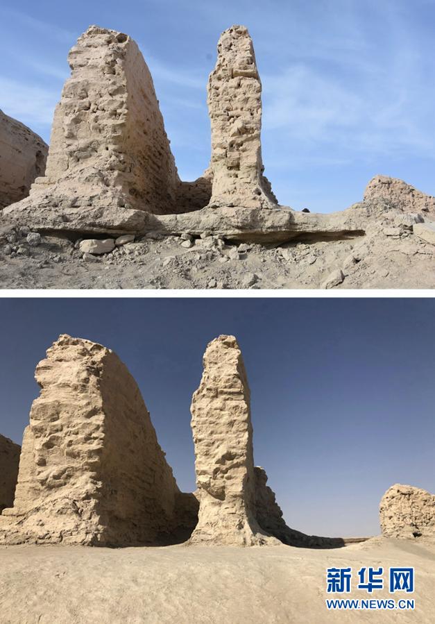 拼版照片:上圖為搶險(xiǎn)加固前的三間房遺址局部(2019年11月14日攝);下圖為搶險(xiǎn)加固后的三間房遺址局部(10月20日攝)。新華社發(fā)