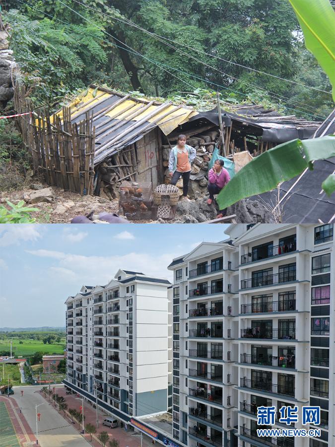 這是一張拼版照片,上圖為:2018年11月11日在廣西田東縣思林鎮(zhèn)龍邦村拍攝的村民和自家簡陋的房屋(思林鎮(zhèn)政府供圖);下圖為:2019年8月28日拍攝的當(dāng)?shù)貫辇埌畲逍陆ǖ奈挥趶V西田東縣思林鎮(zhèn)的易地扶貧搬遷安置點(diǎn)(無人機(jī)照片,新華社記者 曹祎銘 攝)。新華社發(fā)