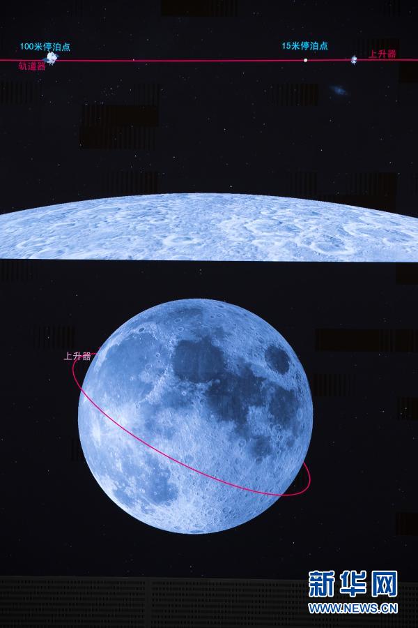 這是12月6日在北京航天飛行控制中心指揮大廳拍攝的嫦娥五號(hào)上升器與軌道器返回器組合體交會(huì)對(duì)接畫(huà)面。