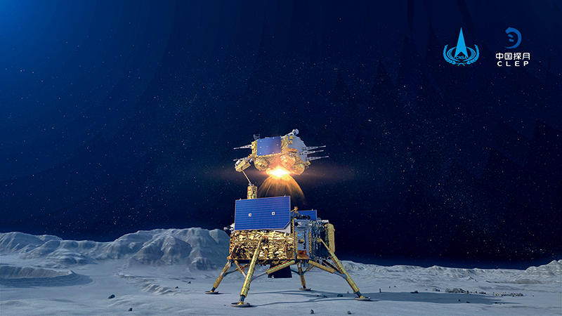 12月3日23時10分,嫦娥五號上升器月面點火,3000 牛發(fā)動機(jī)工作約6 分鐘后,順利將攜帶月壤的上升器送入到預(yù)定環(huán)月軌道,成功實現(xiàn)我國首次地外天體起飛。這是嫦娥五號上升器月面點火瞬間模擬 圖國家航天局供圖