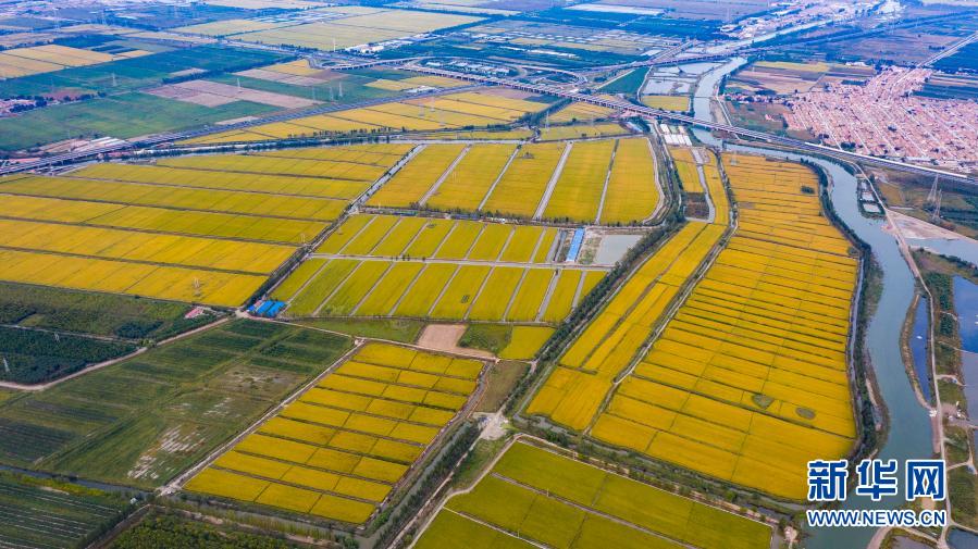 9月22日拍攝的河北省唐山市蘆臺(tái)經(jīng)濟(jì)開(kāi)發(fā)區(qū)海北鎮(zhèn)的水稻田(無(wú)人機(jī)照片)。
