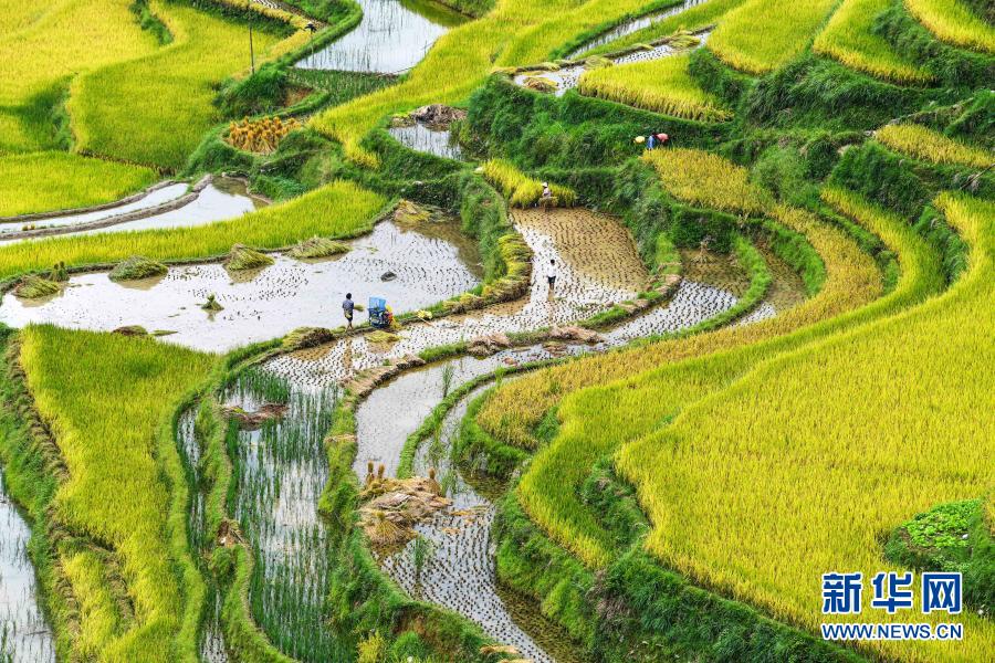 貴州省從江縣加榜鄉(xiāng)黨扭村的農(nóng)民在收割水稻(9月19日攝)。