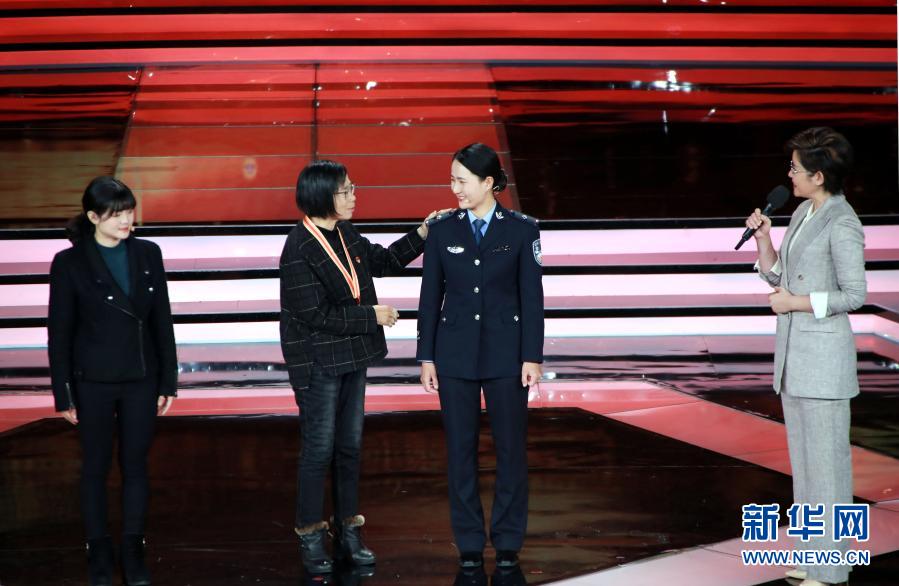 張桂梅(左二)在“時(shí)代楷?!卑l(fā)布儀式上介紹自己的兩名學(xué)生(12月7日攝)。新華社記者 潘旭 攝
