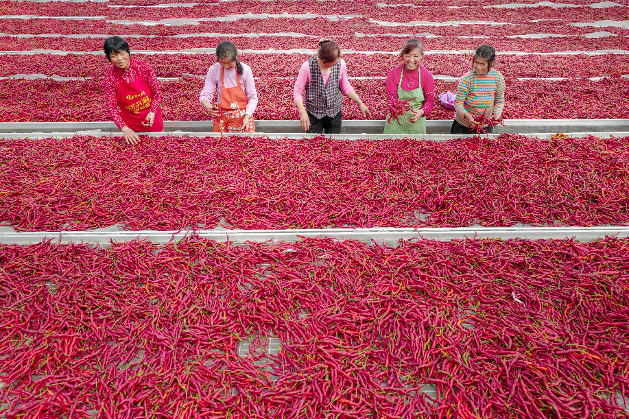 ??????2020年拍攝于陜西興平桑鎮(zhèn)西橋村金鵬辣蒜專業(yè)合作社,農(nóng)民將辣椒揚(yáng)起晾曬。(組照4)張綺云 攝