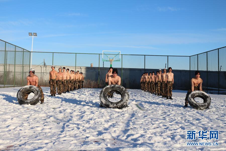 武警黑龍江總隊(duì)黑河支隊(duì)官兵冒著零下20攝氏度嚴(yán)寒在雪中開展翻輪胎訓(xùn)練(12月10日攝)。新華社發(fā)(李響 攝)