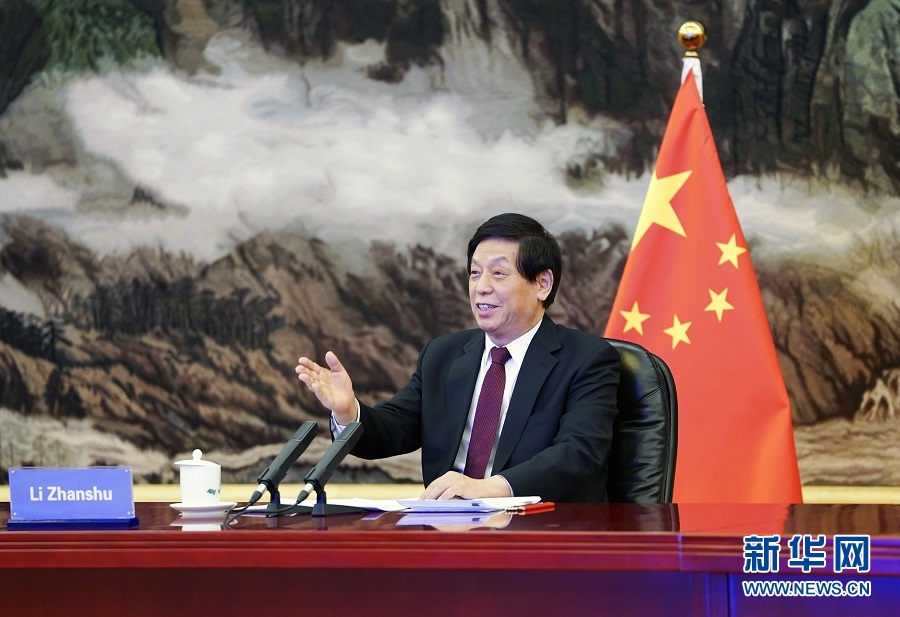 12月21日,全國人大常委會(huì)委員長栗戰(zhàn)書在北京人民大會(huì)堂以視頻方式同韓國國會(huì)議長樸炳錫舉行會(huì)談。新華社記者 張領(lǐng) 攝