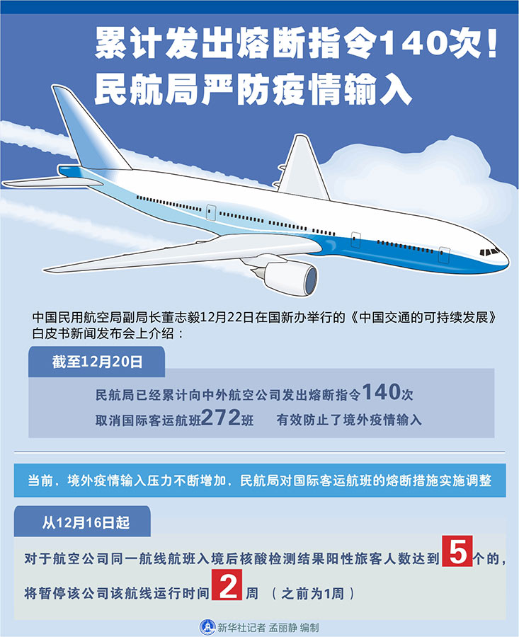 新華社北京12月22日電(記者周圓、魏玉坤)中國民用航空局副局長董志毅22日在國新辦舉行的《中國交通的可持續(xù)發(fā)展》白皮書新聞發(fā)布會上介紹,截至12月20日,民航局已經累計向中外航空公司發(fā)出熔斷指令140次,取消國際客運航班272班,有效防止了境外疫情輸入。