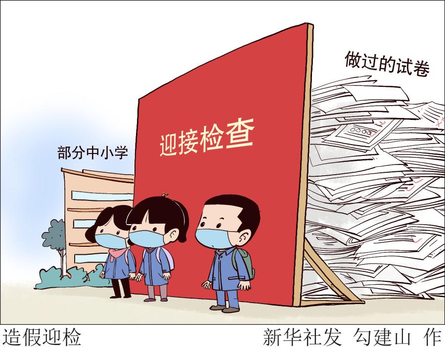 “明天學(xué)校迎接本學(xué)期檢查,所有做過的試卷都放在家里!”“檢查組要來,學(xué)校文化墻上再貼幾個(gè)標(biāo)語”……進(jìn)入12月后,部分中小學(xué)師生全力以赴迎檢,有的學(xué)校甚至停止正常的教育教學(xué),反復(fù)叮囑孩子“藏好試卷”,造假迎檢。
