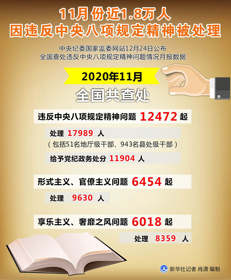 新華社北京12月24日電(記者孫少龍)中央紀委國家監(jiān)委網(wǎng)站24日公布全國查處違反中央八項規(guī)定精神問題情況月報數(shù)據(jù)。通報顯示,2020年11月,全國共查處違反中央八項規(guī)定精神問題12472起,處理17989人(包括51名地廳級干部、943名縣處級干部),給予黨紀政務處分11904人。