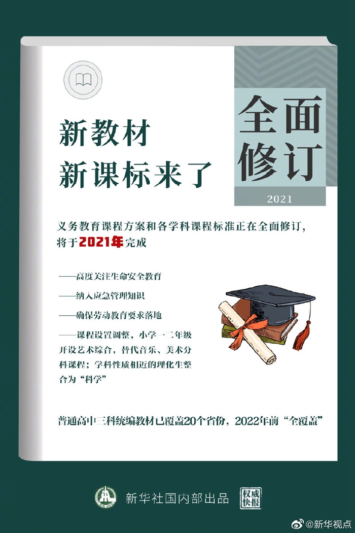 中小學(xué)校開(kāi)什么課?學(xué)什么?怎么學(xué)?12月24日,教育部召開(kāi)新聞發(fā)布會(huì)介紹,義務(wù)教育課程方案和各學(xué)科課程標(biāo)準(zhǔn)正在全面修訂,將于2021年完成。此外,普通高中道德與法治(思想政治)、語(yǔ)文、歷史三科統(tǒng)編教材已覆蓋20個(gè)省份,2022年前將實(shí)現(xiàn)所有省份“全覆蓋”,到2025年實(shí)現(xiàn)所有年級(jí)“全覆蓋”。(記者胡浩 海報(bào)設(shè)計(jì)張晨光)