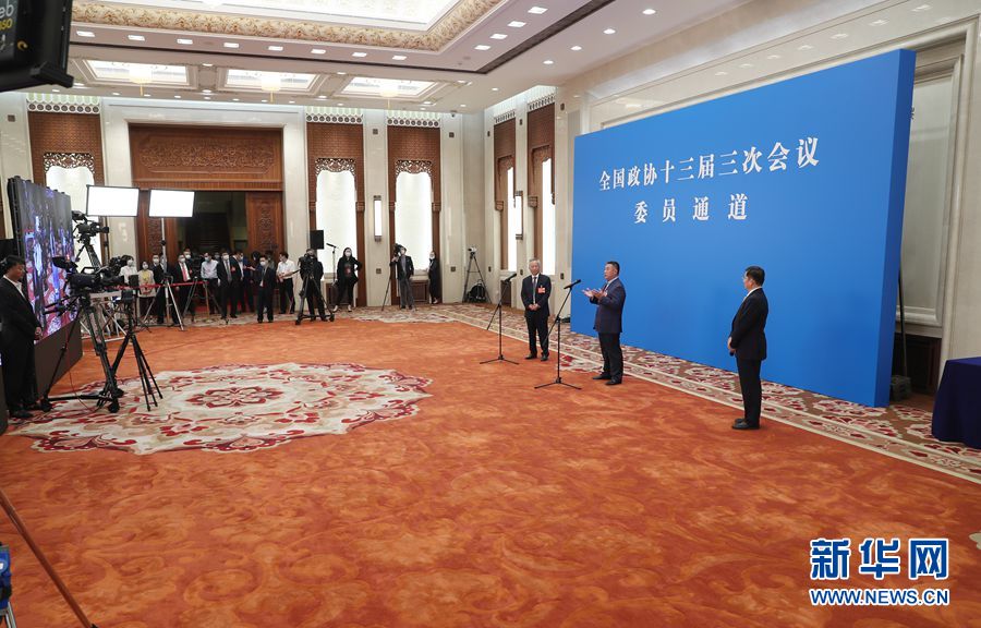 全國政協(xié)十三屆三次會議首場“委員通道”采訪活動于5月21日在人民大會堂新聞發(fā)布廳舉行,邀請部分全國政協(xié)委員通過網(wǎng)絡視頻方式接受媒體采訪。圖為“委員通道”現(xiàn)場。新華網(wǎng) 王翰林 攝