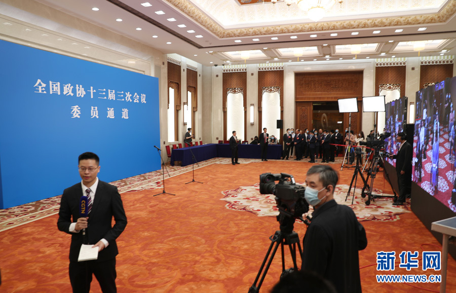 ??? 全國(guó)政協(xié)十三屆三次會(huì)議首場(chǎng)“委員通道”采訪活動(dòng)于5月21日在人民大會(huì)堂新聞發(fā)布廳舉行,邀請(qǐng)部分全國(guó)政協(xié)委員通過網(wǎng)絡(luò)視頻方式接受媒體采訪。圖為“委員通道”現(xiàn)場(chǎng)。新華網(wǎng) 王翰林 攝