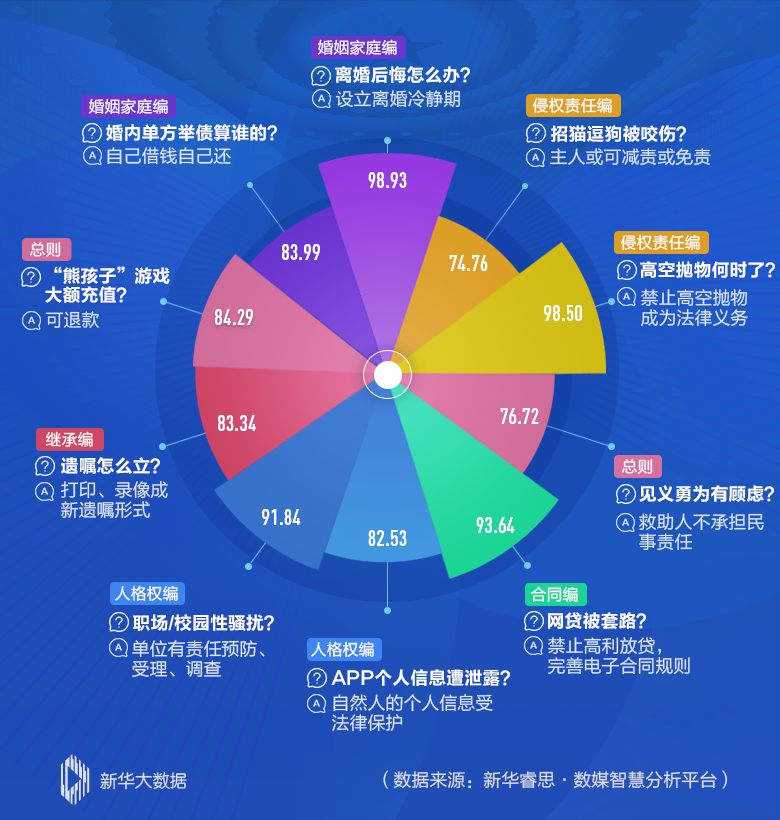 民法典草案1260個條文中,哪些最受關(guān)注?新華睿思數(shù)據(jù)顯示,最吸引人的話題為“離婚冷靜期”,網(wǎng)絡(luò)熱度值高達(dá)98.93,緊隨其后的,是與百姓日常生活緊密相關(guān)的“高空拋物”和涉及群眾“錢袋子”的“高利放貸”。