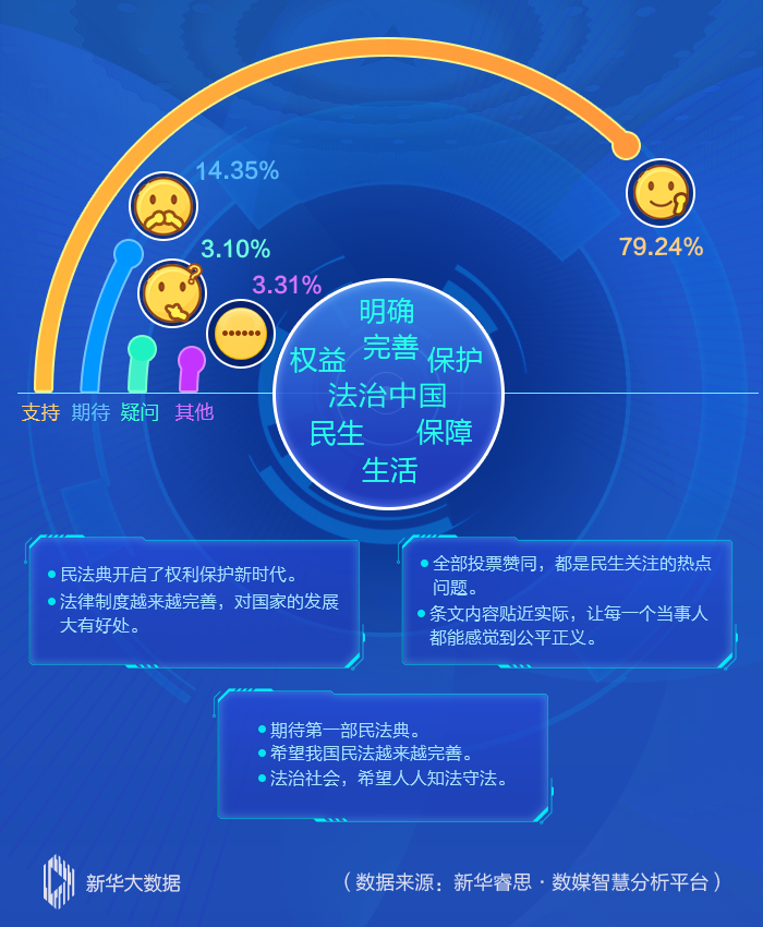 新華睿思數(shù)據(jù)顯示,近八成網(wǎng)民對民法典草案表示支持和肯定,認(rèn)為“民法典開啟了權(quán)利保護(hù)新時代”“法治中國給老百姓帶來實(shí)實(shí)在在的好處”。從話題熱詞分析來看,“法治中國”“完善”“保護(hù)”三大熱詞有效地呼應(yīng)了編纂民法典的出發(fā)點(diǎn)和落腳點(diǎn)。