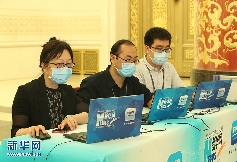 2020年5月28日下午十三屆全國人大三次會議閉幕后,國務(wù)院總理李克強(qiáng)在人民大會堂三樓金色大廳出席記者會并回答中外記者提問。為有效防控疫情,共同維護(hù)公共衛(wèi)生與健康,記者會采用網(wǎng)絡(luò)視頻形式進(jìn)行。圖為新華網(wǎng)現(xiàn)場直播團(tuán)隊(duì)。 新華網(wǎng) 王翰林 攝