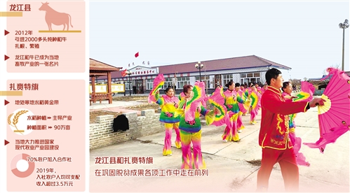 龍江縣是著名的雜糧產(chǎn)區(qū)、畜牧大縣。如今,龍江和牛已成為龍江縣畜牧產(chǎn)業(yè)的一張名片,帶領(lǐng)群眾走上致富路?!拔覀冄芯恐贫恕陡邫n肉牛優(yōu)勢(shì)特色產(chǎn)業(yè)集群建設(shè)方案》,從2016年起出臺(tái)了扶持政策?!饼埥h委副書記孫立軍告訴記者,當(dāng)?shù)匾龑?dǎo)企業(yè)與農(nóng)戶合作養(yǎng)牛,農(nóng)戶每購(gòu)買兩頭母牛,政府會(huì)給予一定的補(bǔ)貼款。此外,政府還向企業(yè)采購(gòu)凍精幫助農(nóng)戶繁育小牛,小牛犢生長(zhǎng)到6個(gè)月達(dá)標(biāo)后,由企業(yè)統(tǒng)一收購(gòu),價(jià)格在1.2萬(wàn)元至1.4萬(wàn)元不等。