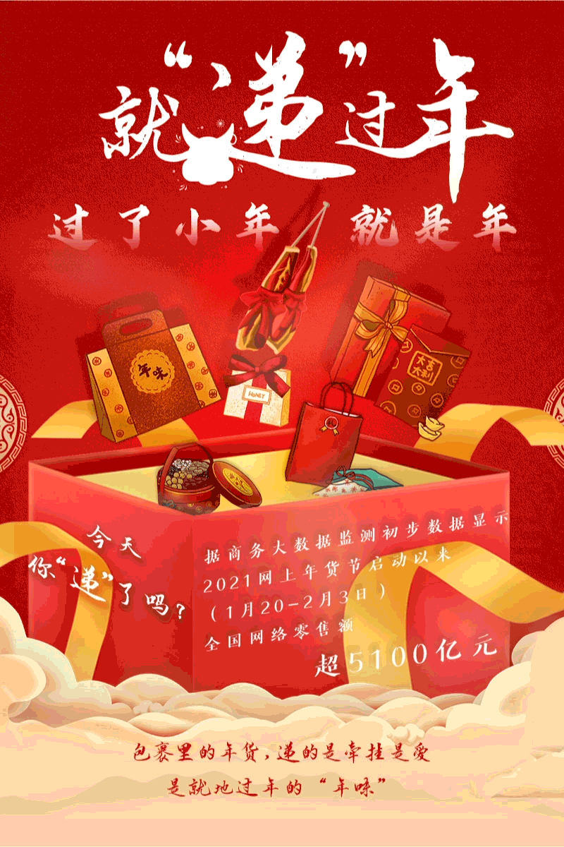 就地過年,年味不減。商務部2月4日發(fā)布數據,由商務部等部門指導開展的“2021年全國網上年貨節(jié)”,自1月20日啟動以來,全國網絡零售額已超5100億元?!霸啤辟從曦?,就“遞”過年,成為人們的新年俗。(記者于佳欣、王雨蕭,設計張晨光)