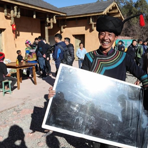 在四川省昭覺縣三河村的易地扶貧安置點(diǎn),彝族群眾馬海日聰喜搬新居(2019年2月11日攝)。2019年2月11日,位于大涼山腹地的四川省昭覺縣三河村首批29戶、168人告別居住多年的土坯房,搬入易地扶貧安置點(diǎn)的新家。新華社記者 江宏景 攝
