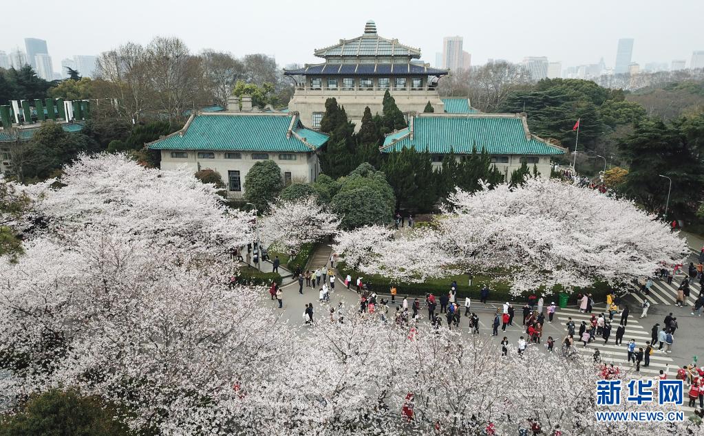 3月13日,武漢大學(xué)抗疫醫(yī)護(hù)人員賞櫻專場(chǎng)啟動(dòng),來(lái)自全國(guó)各地的援鄂抗疫英雄在櫻花樹下重逢,盡享櫻花之約(無(wú)人機(jī)照片)。新華社記者 程敏 攝