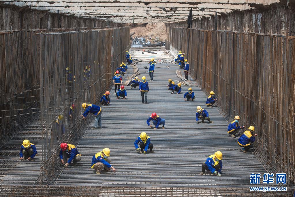 2020年4月30日,來(lái)自中鐵七局的建設(shè)者在武漢武九北綜合管廊工程施工現(xiàn)場(chǎng)作業(yè)。新華社記者 肖藝九 攝