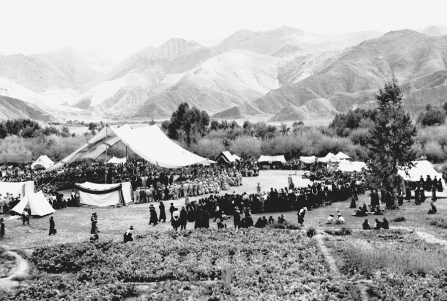 1951年9月,人民解放軍入藏先遣部隊(duì)抵達(dá)拉薩城郊。西藏地方政府在拉薩河畔搭起了巨大的白色帳篷,設(shè)立了十里長亭,隆重?zé)崃覛g迎解放軍入城。 新華社圖片