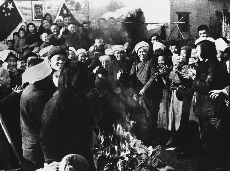 土地改革中湖南岳陽縣策口鄉(xiāng)農(nóng)民燒毀舊地契。 新華社圖片