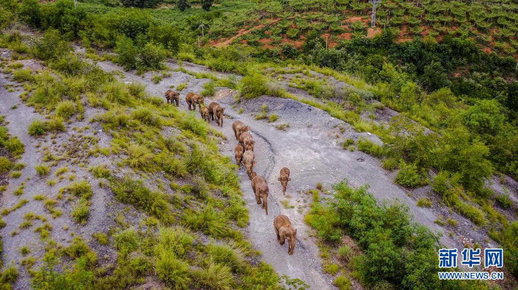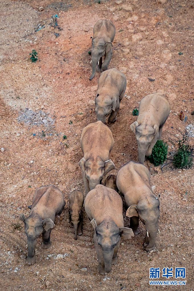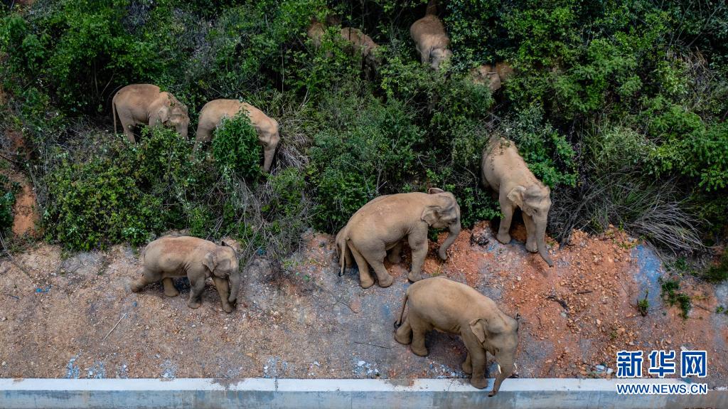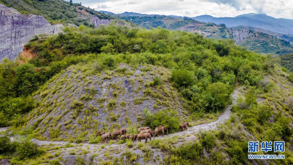 這是5月28日在云南省玉溪市峨山縣境內拍攝的象群(無人機照片)。新華社記者 胡超 攝