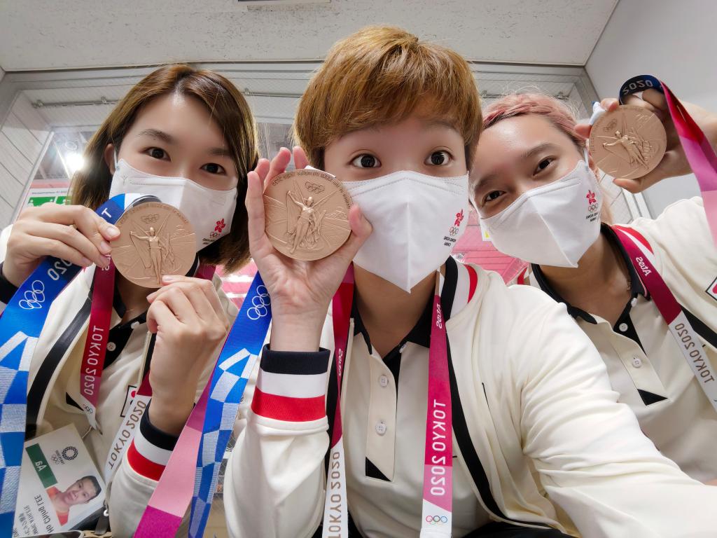 杜凱琹(中)和隊(duì)友們與奧運(yùn)獎牌合影。受訪者供圖