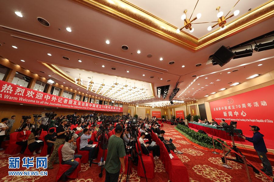 9月24日,慶祝中華人民共和國(guó)成立70周年活動(dòng)新聞中心在北京梅地亞中心二層新聞發(fā)布廳舉辦第一場(chǎng)專題集體采訪。圖為新聞發(fā)布會(huì)現(xiàn)場(chǎng)。新華網(wǎng)記者 郭小天 攝