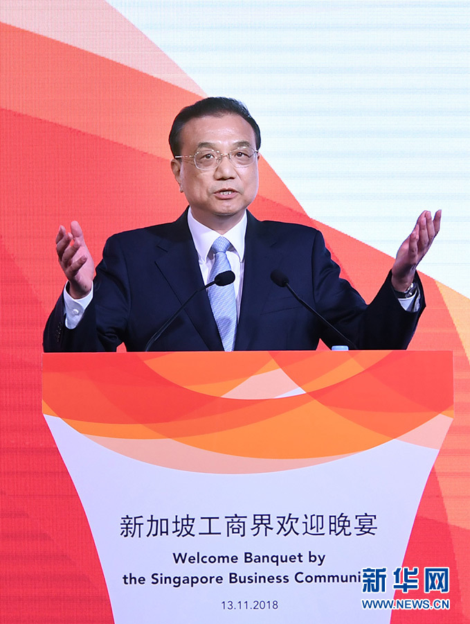 新華社新加坡11月13日電(記者張正富 楊定都)國務院總理李克強當?shù)貢r間11月13日晚在新加坡出席新加坡工商聯(lián)合總會和中華總商會聯(lián)合舉辦的歡迎晚宴并致辭。