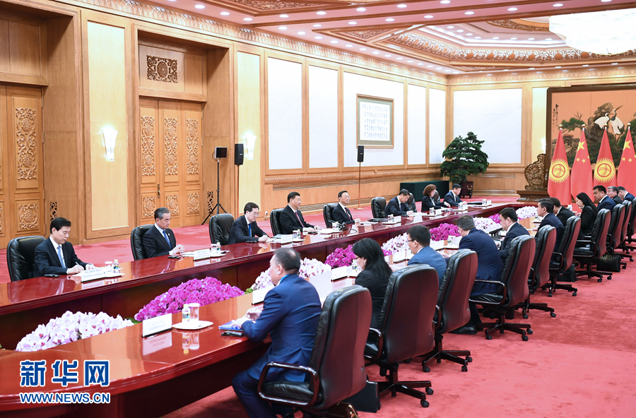 4月28日,國家主席習近平在北京人民大會堂會見吉爾吉斯斯坦總統(tǒng)熱恩別科夫。 新華社記者 謝環(huán)馳 攝