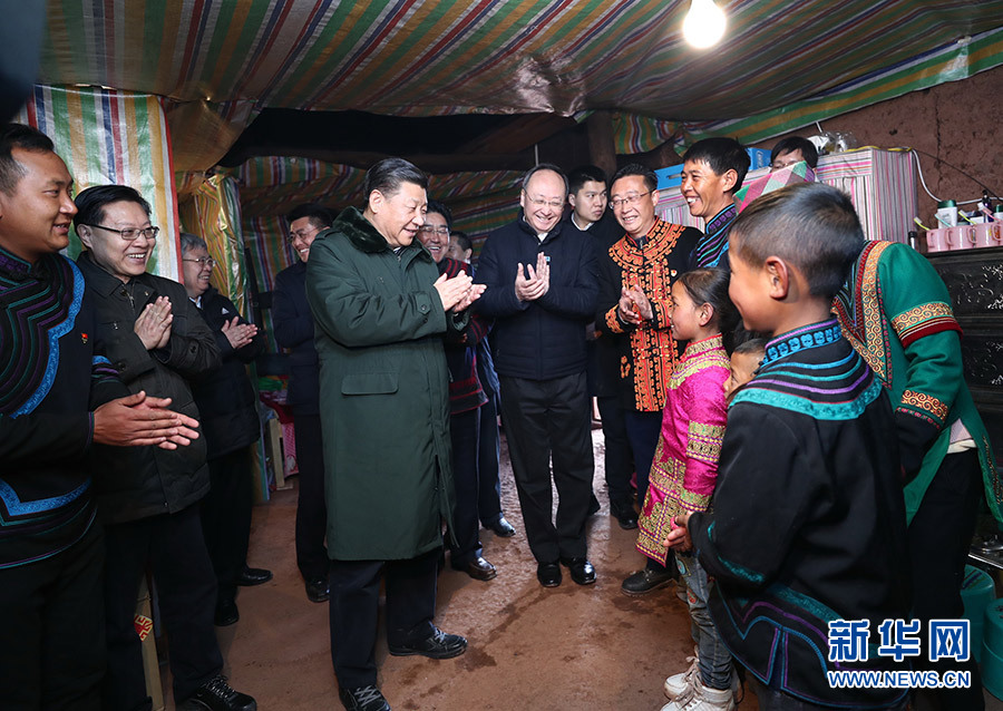2018年2月11日,農(nóng)歷春節(jié)來臨之際,習(xí)近平在四川涼山彝族自治州昭覺縣三岔河鄉(xiāng)三河村貧困戶吉好也求家中看望,聽10歲小女孩吉好有果唱《國旗國旗真美麗》。 新華社記者 鞠鵬 攝