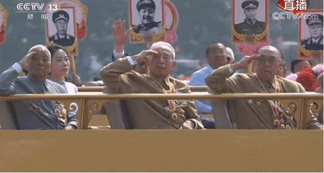 ?一曲《紅旗頌》奏響,當(dāng)“致敬方陣”的禮賓車上,老一輩黨和國(guó)家、軍隊(duì)領(lǐng)導(dǎo)人親屬代表,老一輩建設(shè)者和親屬代表,新中國(guó)成立前參加革命工作的老戰(zhàn)士,老一輩軍隊(duì)退役英模、民兵英模和支前模范代表等從天安門前經(jīng)過(guò)時(shí),全場(chǎng)所有人自發(fā)起立,向英雄們致以崇高的敬意?! ?