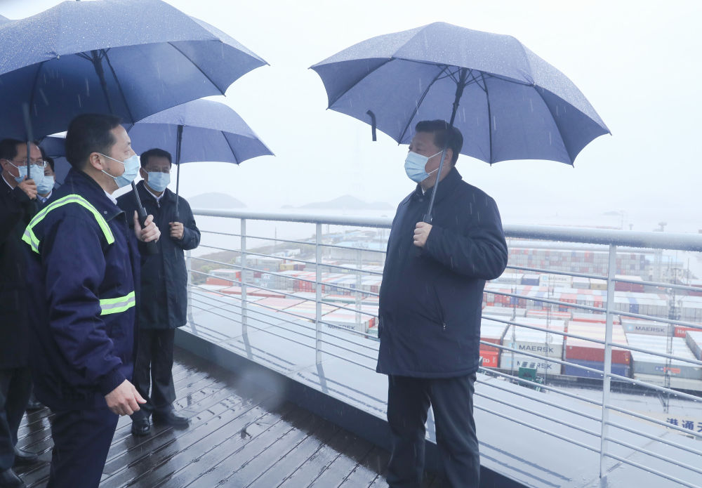當時,總書記正在穿山港區(qū)2號集裝箱泊位察看碼頭現(xiàn)場作業(yè)情況。海風卷著細雨,空氣十分清新,周邊環(huán)境也很空曠,人員之間保持著比較大的距離。↓↓↓