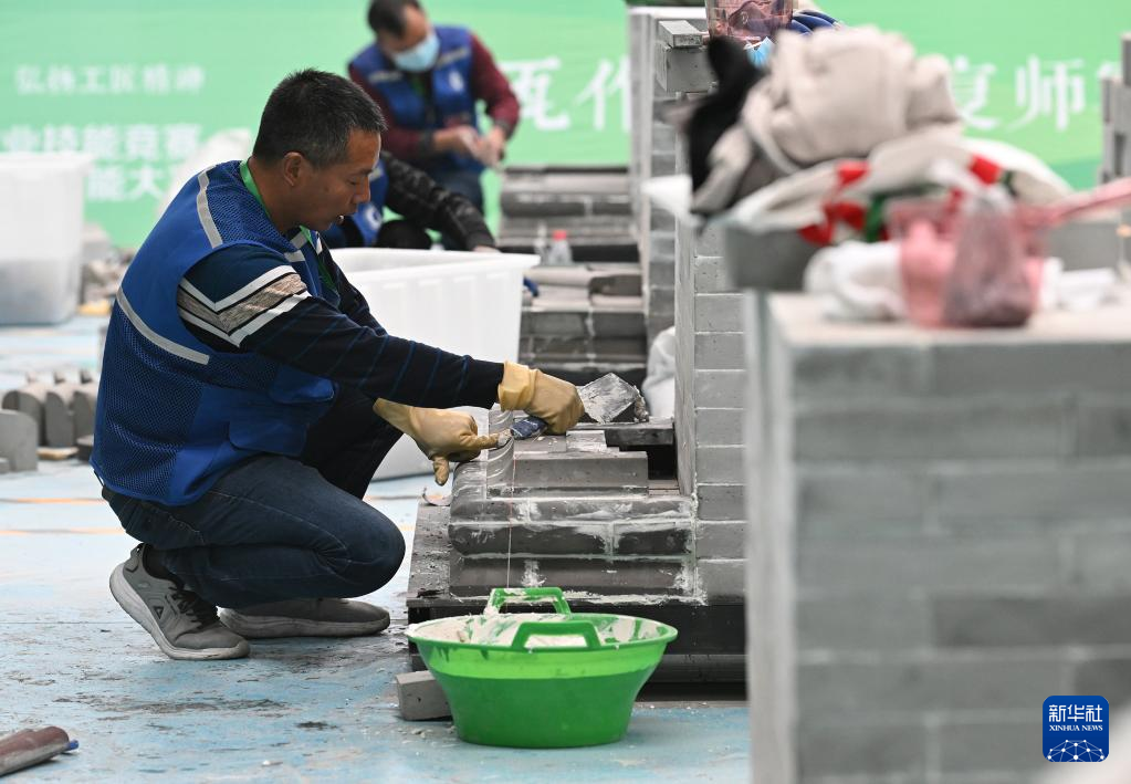 一位参加泥瓦作文物修复师比赛项目的选手运用传统技术进行建筑材料的加工(3月25日摄)。