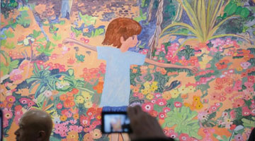 3月30日,一名观众在俄罗斯莫斯科达尔文博物馆参观中国绘画展。
