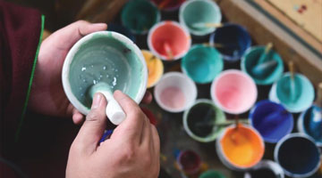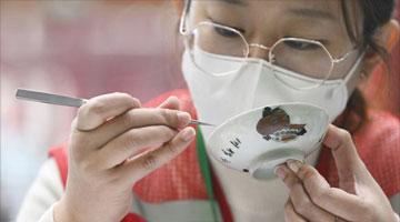 3月30日,一位参展者在俄罗斯莫斯科达尔文博物馆中国绘画展上现场作画。