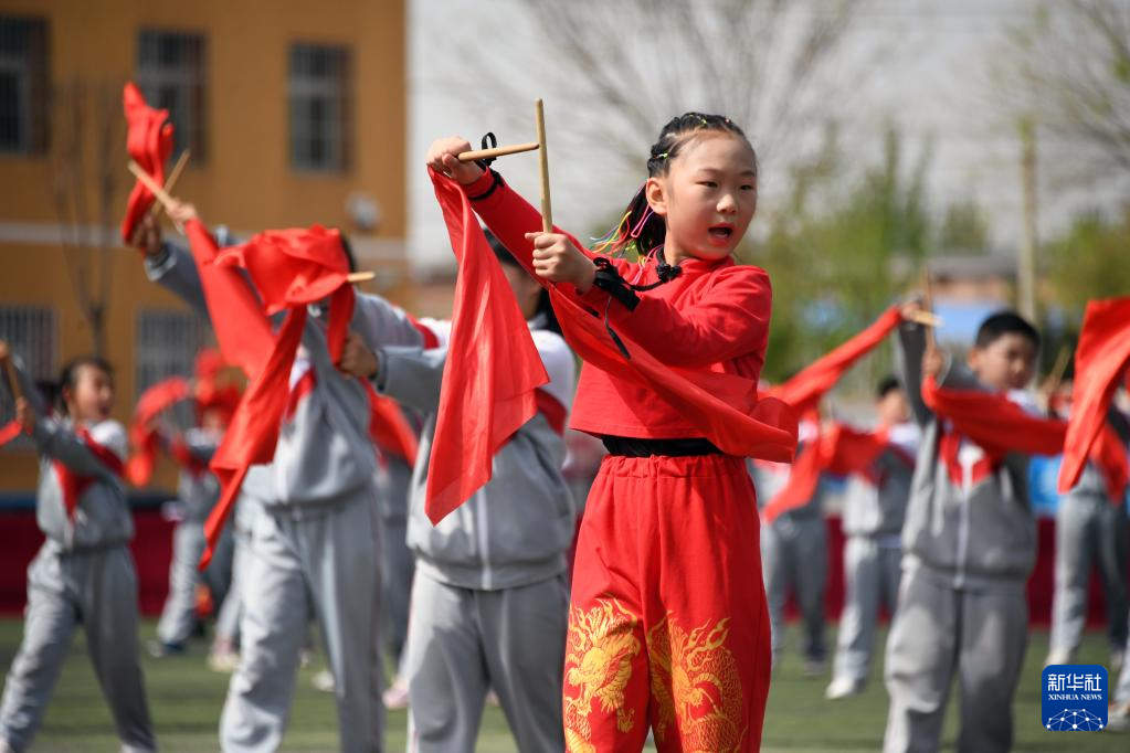 4月19日,门楼中心小学的学生在活动中表演鼓韵操。
