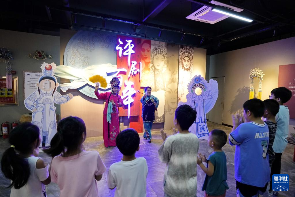 7月21日,孩子们在位于河北省滦州市的中国评剧艺术馆内了解评剧知识。