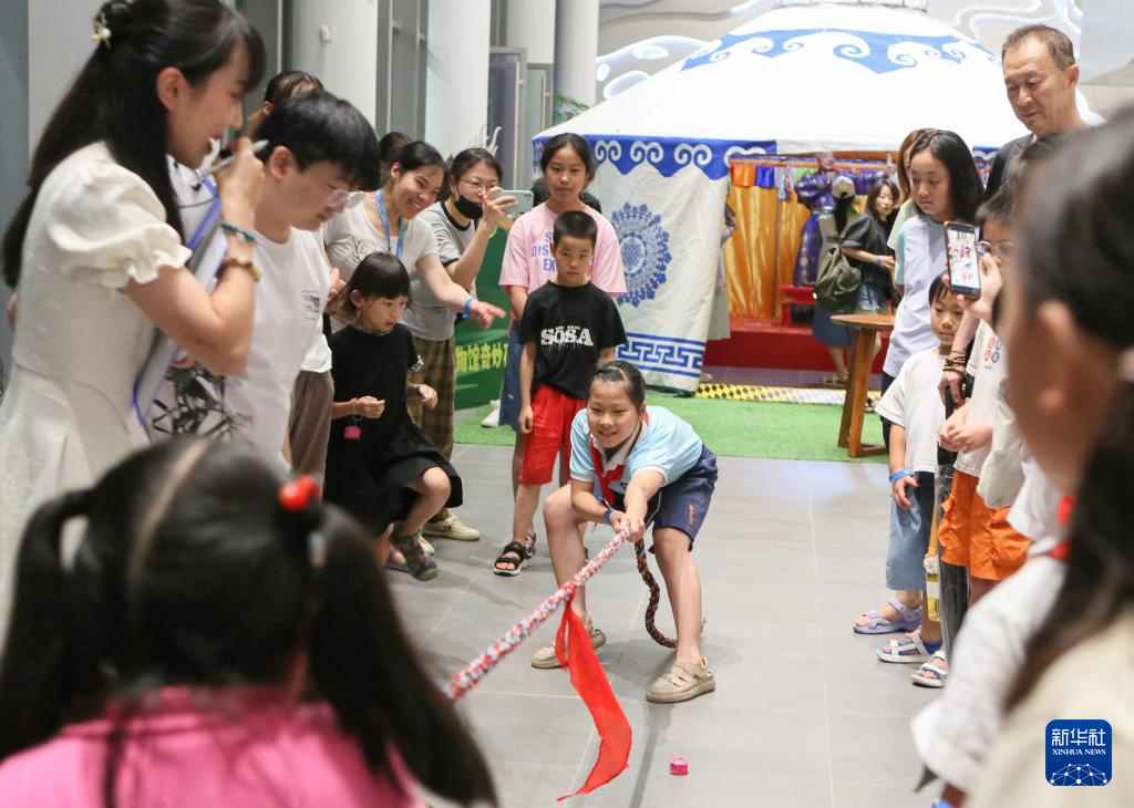 当日,为配合“漠北锋鸣——鄂尔多斯青铜器文物精品展”,助力城市夜经济发展,上海市闵行区博物馆开展夜间“那达慕”大会。参观者可以体验射箭、拔河,品尝特色美食,充分感受民俗风情的魅力。