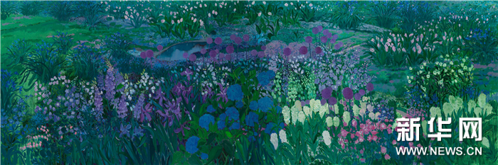李江峰《大丽花丛戏大鹅》 98x290cm 2023年