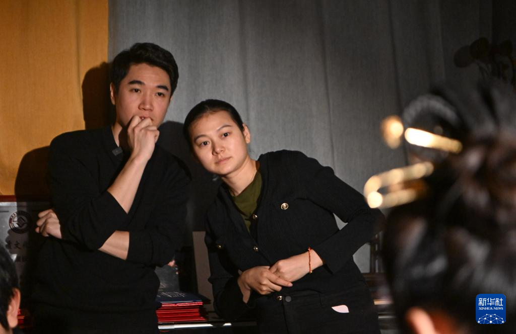 马赛(左)在工作室内与女朋友闵方苹在汉服爱好者佩戴头饰时商讨制作细节(3月7日摄)。
