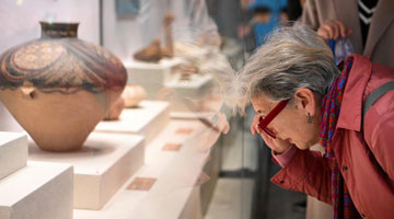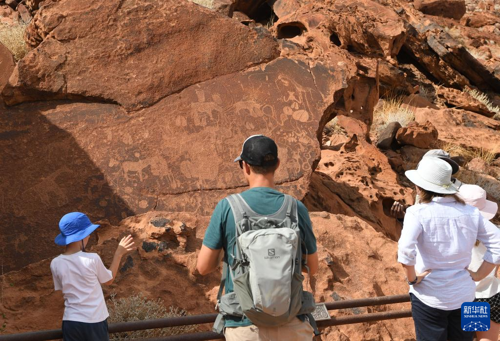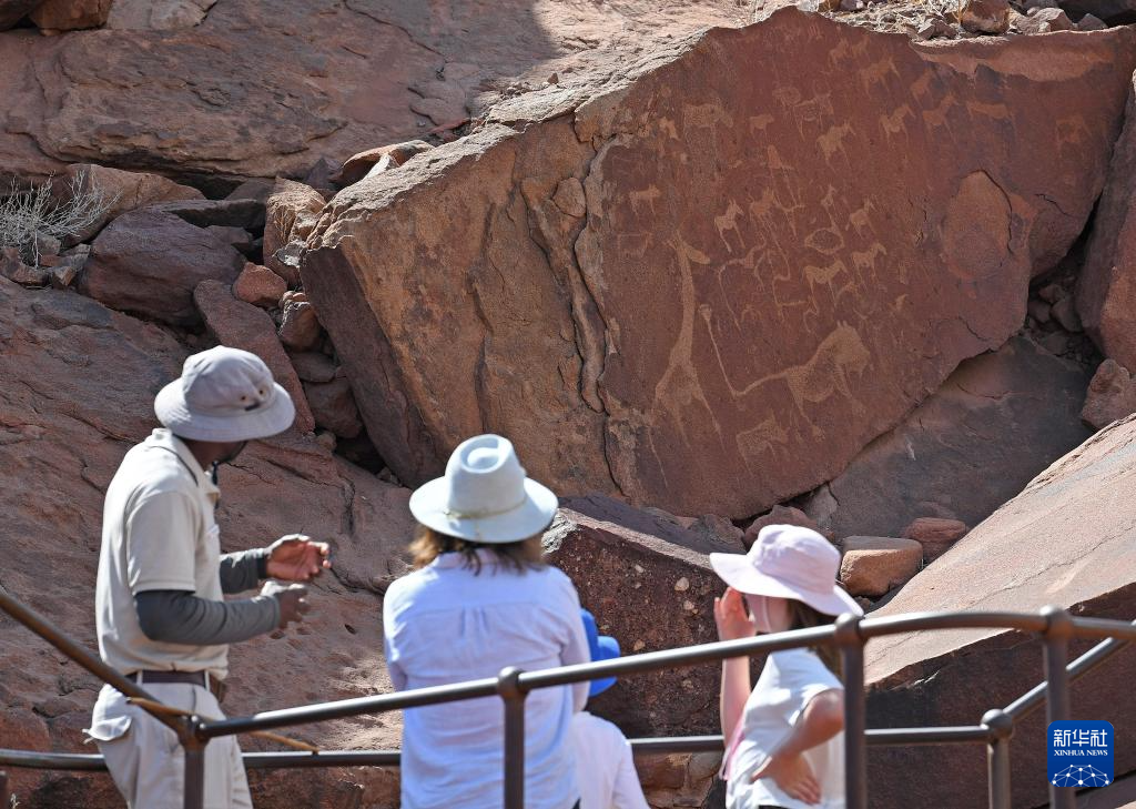3月26日,在纳米比亚库内内省,游客欣赏颓废方丹岩画。