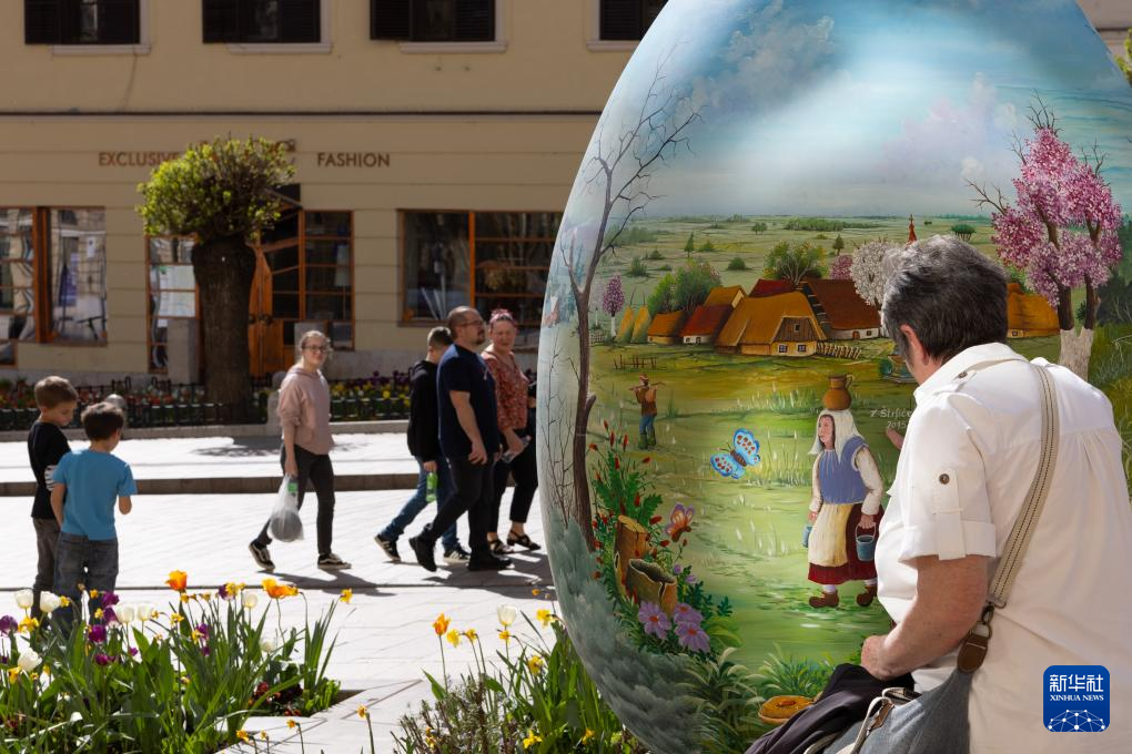 3月30日,人们在匈牙利南部城市佩奇街头参观复活节巨型彩蛋。新华社发(弗尔季·奥蒂洛摄)
